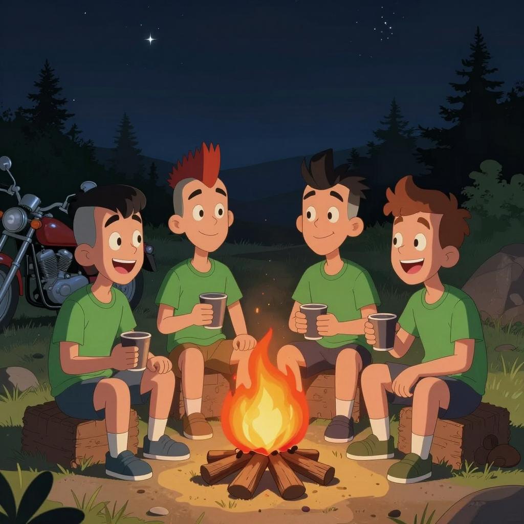 Illustration of four cartoon men with exaggerated features sitting around a campfire at night. They wear green t-shirts, shorts, and have distinct hairstyles. One has a mohawk, another a pompadour. They are holding cups and smiling. A motorcycle is in the background. The sky is dark with stars.