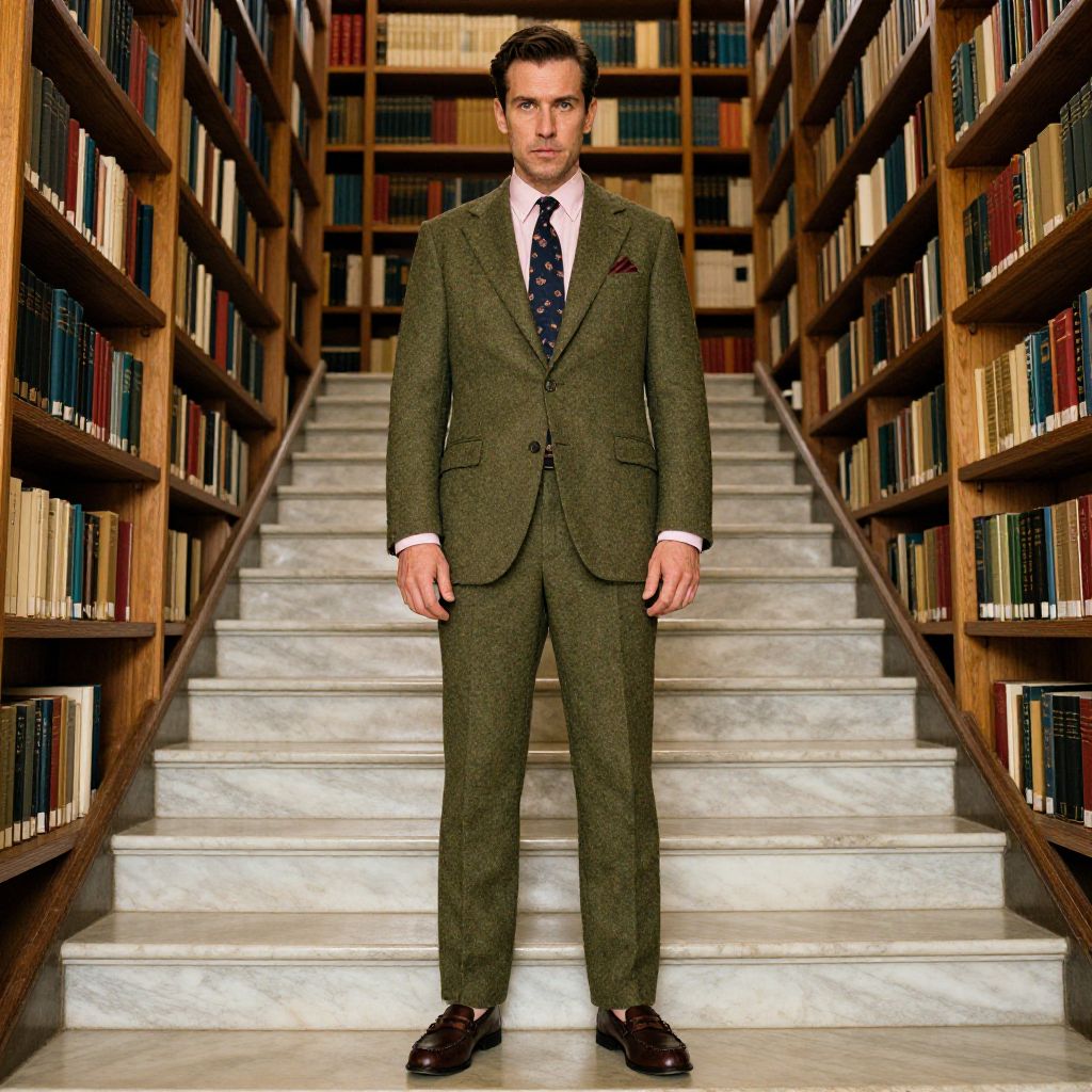 A man, olive green tweed suit, pale pink dress shirt, navy paisley tie, dark brown leather loafers, grand marble staircase, towering bookshelves, warm golden light, oversaturated film, confident expression Man has masculine face and piercing eyes