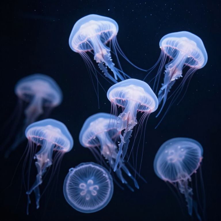 A cluster of ethereal, translucent jellyfish floats serenely in a dark, starlit expanse, their delicate forms illuminated by a soft, radiant glow that defies the depths of the void.