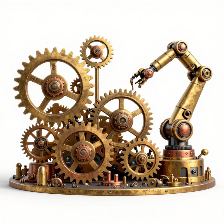 Sistem concept illustrating a mechanical ecosystem with gears, cogs, and robotic arms working in harmony, steampunk style, warm brass and copper tones, intricate details, artistic 3D render with dynamic shading and lighting