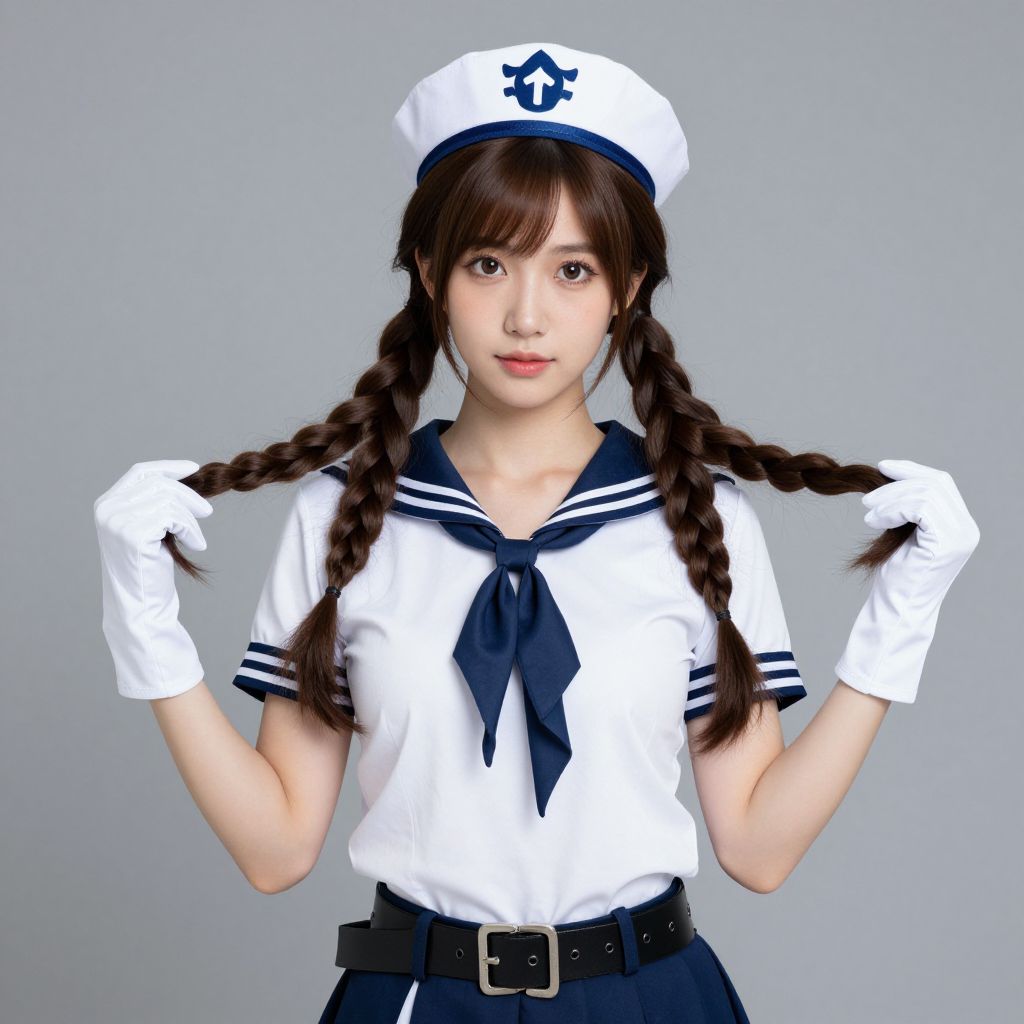 Captain costume girl, 1girl, solo, twin braids, hat, gloves, braid, brown hair, sailor collar, belt, sailor hat, long hair, neckerchief, looking at viewer, shirt