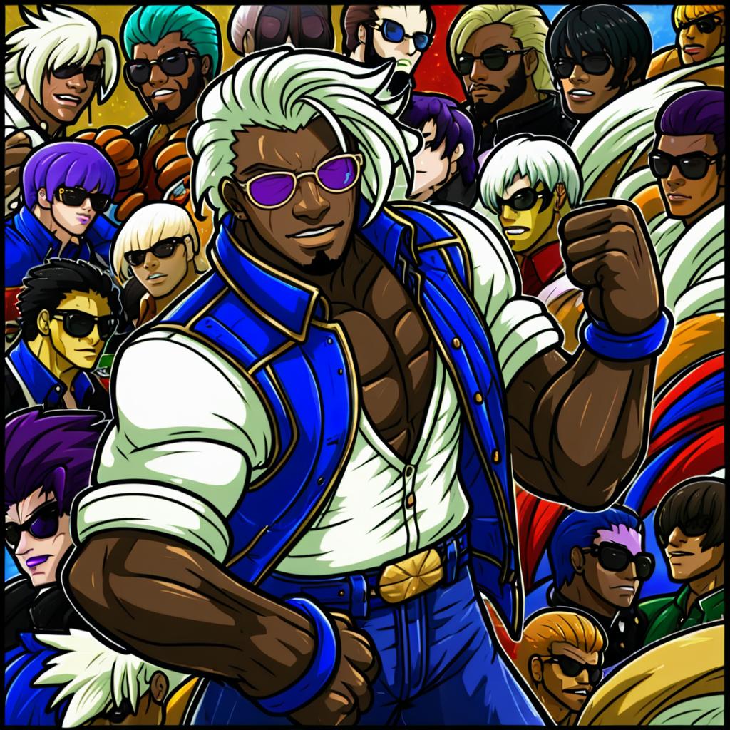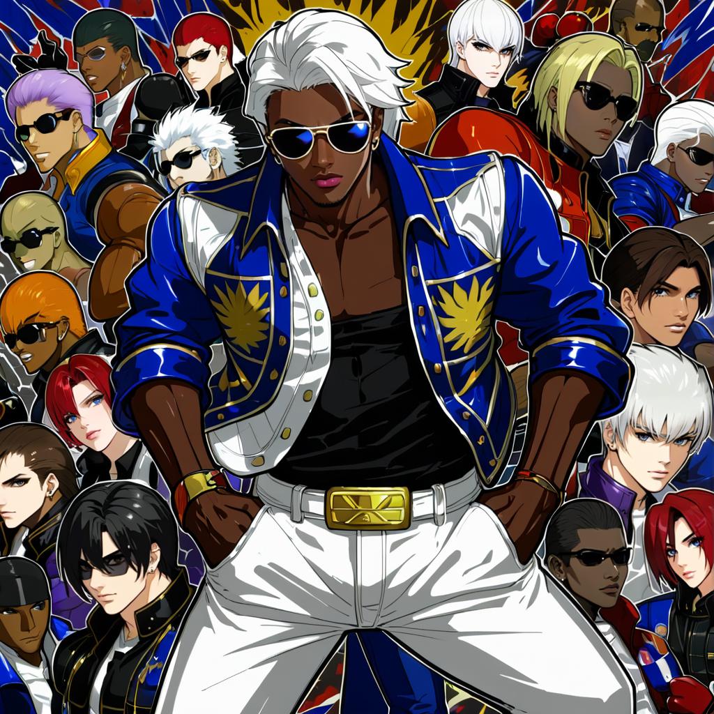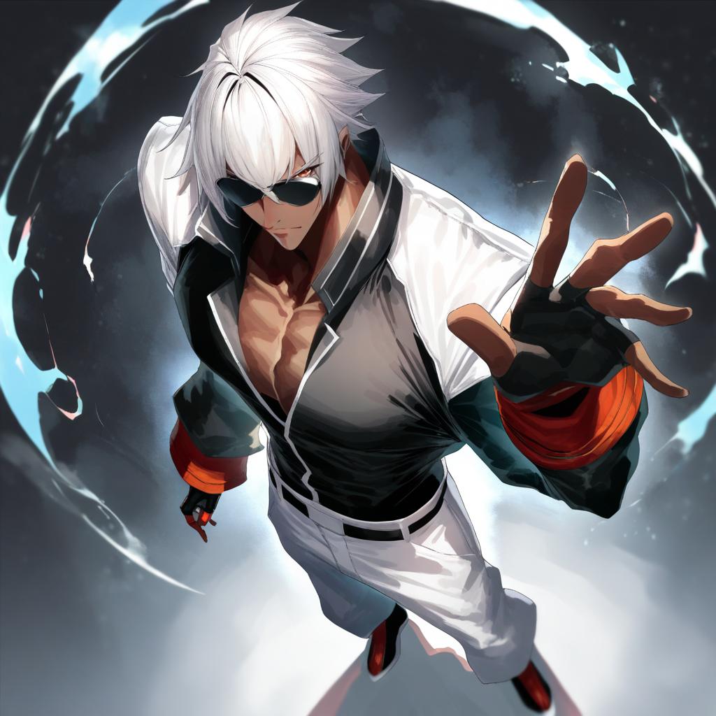 K' (kof), the king of fighters, 1boy, dark-skinned male, white hair, sunglasses, by artist yu yu, anime