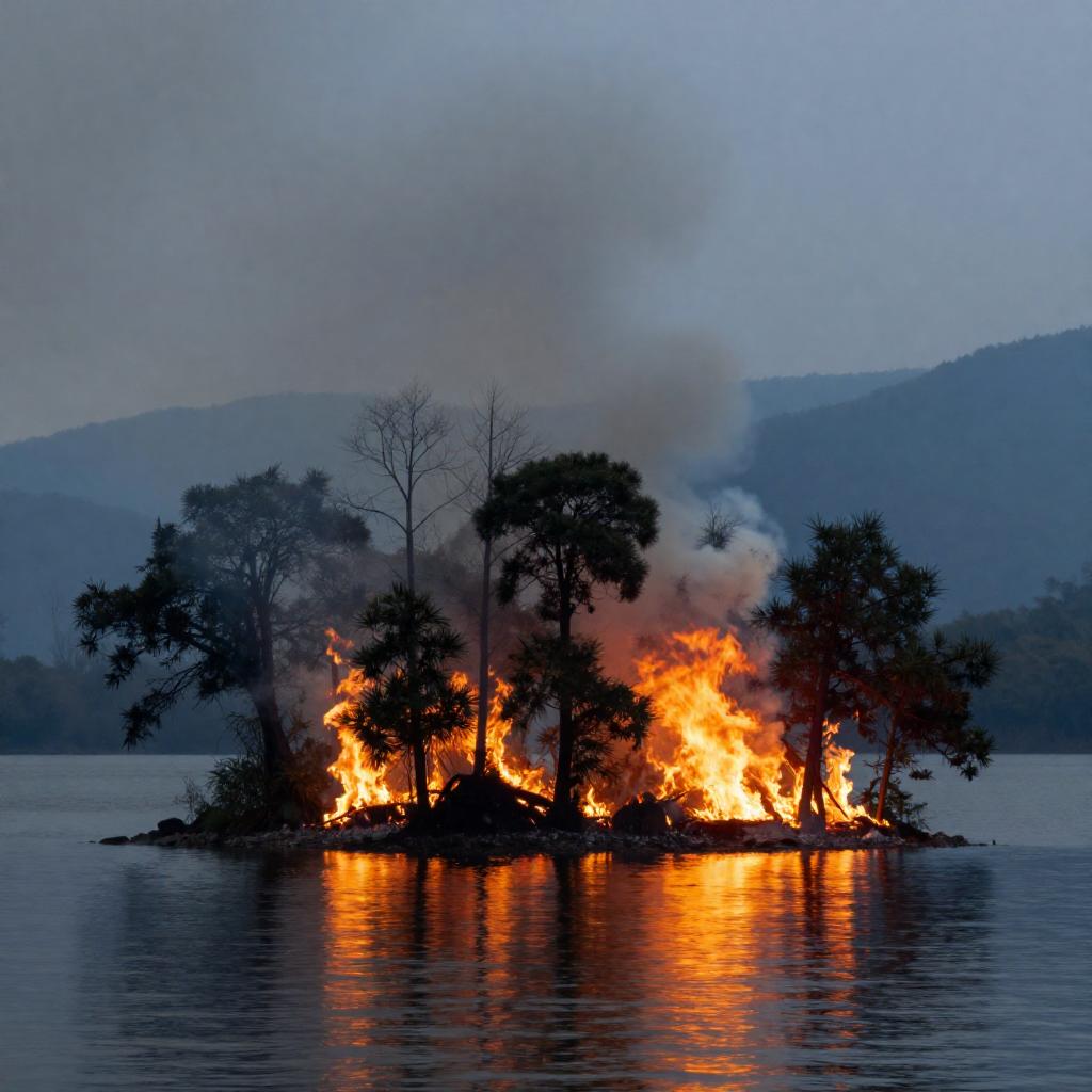 Photograph of a small island engulfed in bright orange flames, with thick smoke rising into a misty, blue-gray sky. The island is surrounded by calm, reflective water, mirroring the fire's glow. Tall trees on the island are silhouetted against the fire, adding contrast to the scene. In the background, dark, mist-covered mountains fade into the distance.