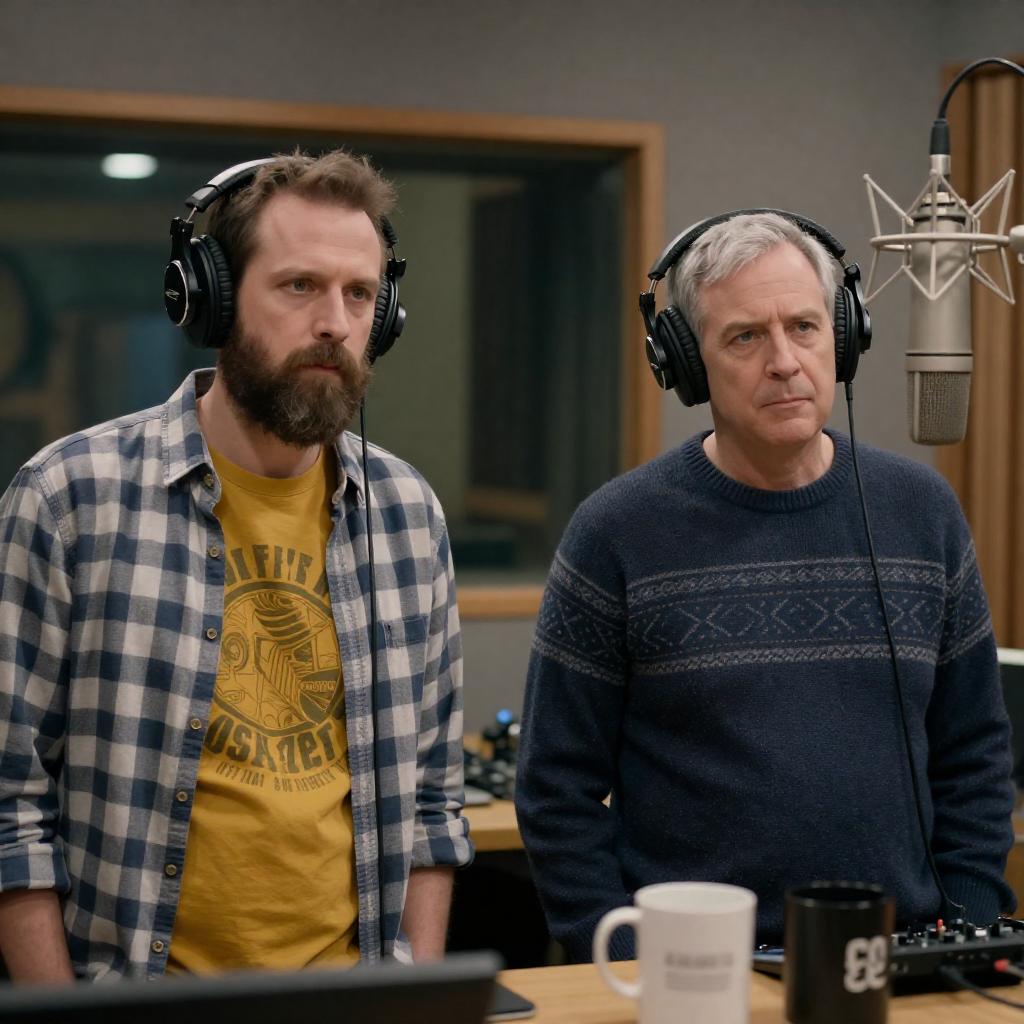 Photograph of two men in a recording studio. Both wear headphones around their necks. Left man has brown hair, beard, checkered shirt, yellow graphic tee. Right man has gray hair, blue patterned sweater. Both have serious expressions. Microphone on right, wooden frame window in background. Desk with mugs and equipment in front.