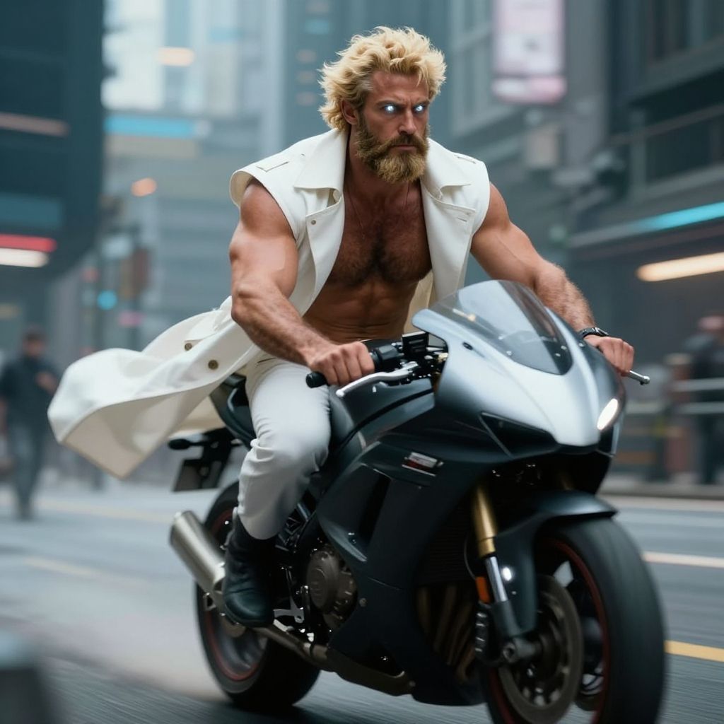 Cinematic, cyberpunk, futuristic, mythology, full body action shot. muscular, shirtless, naturally-blond, 30-year-old, Greek supervillain. his skin is a medium-tan hue. he has a wide face, (short wavy hair, blond beard:1.4). he wears a ((sleeveless, open, unbuttoned:1.6), white trench coat:1.5). he has one glowing eye, hairy arms, hairy chest, hairy body, body hair. (he is riding a sports-motorcycle through a populous cyberpunk city:1.3)