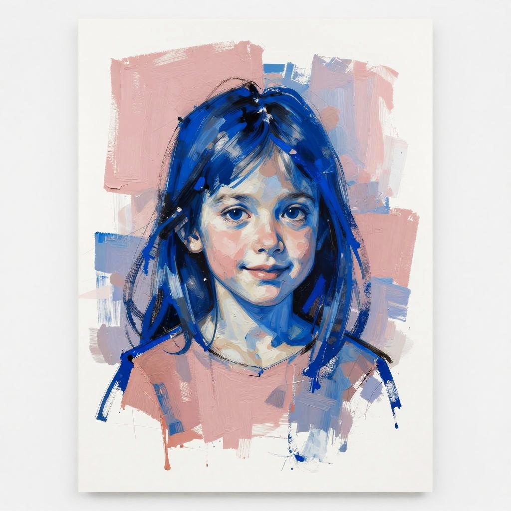 Expressionist semi-abstract portrait of nested female child outlined in cerulean and dusty rose color patches, rendered in modernist mixed-media collage blending acrylic and bold charcoal strokes, high-contrast bold colors, loose gestural strokes and textured paint ridges, minimal white negative space with asymmetrical crop, cobalt-shadow accents and suggestive contours, emotive hopeful innocence intertwined with subtle melancholy, contemporary art poster vibe, painterly chaos with subtle drips, unresolved edges, luminous highlights.