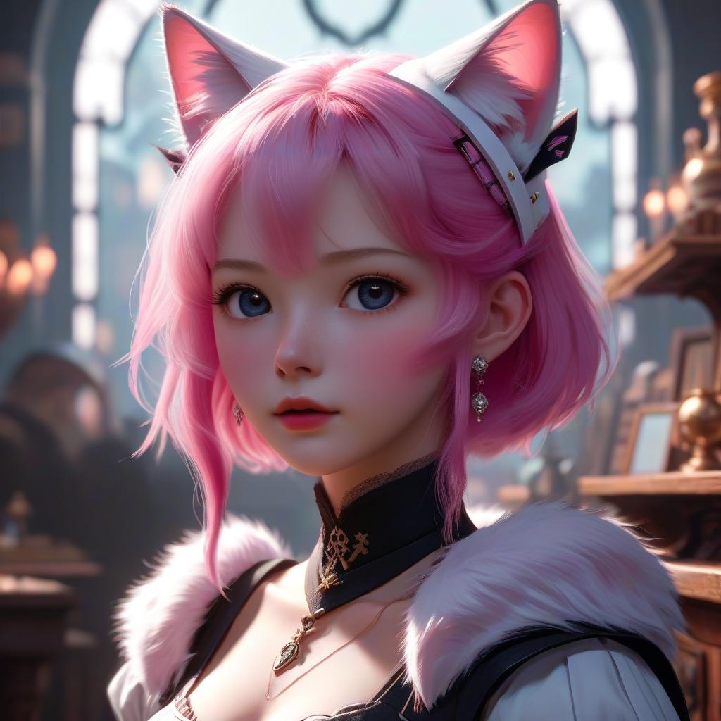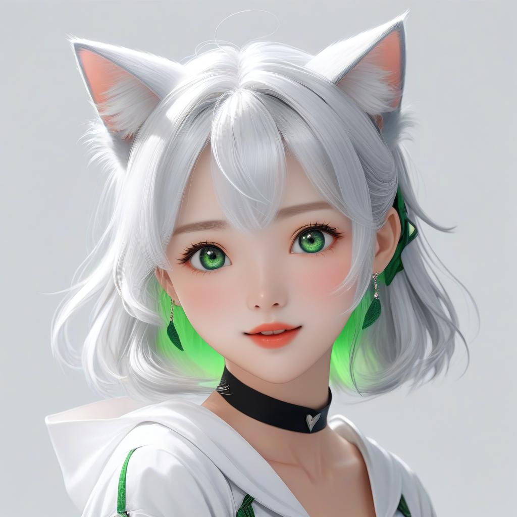 Digital anime-style portrait of a cute, young girl with silver cat ears, green eyes, white hair, green accents, black choker, and white