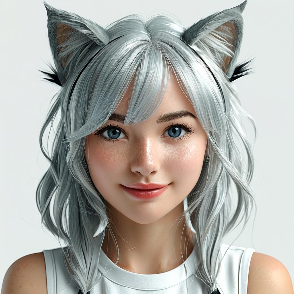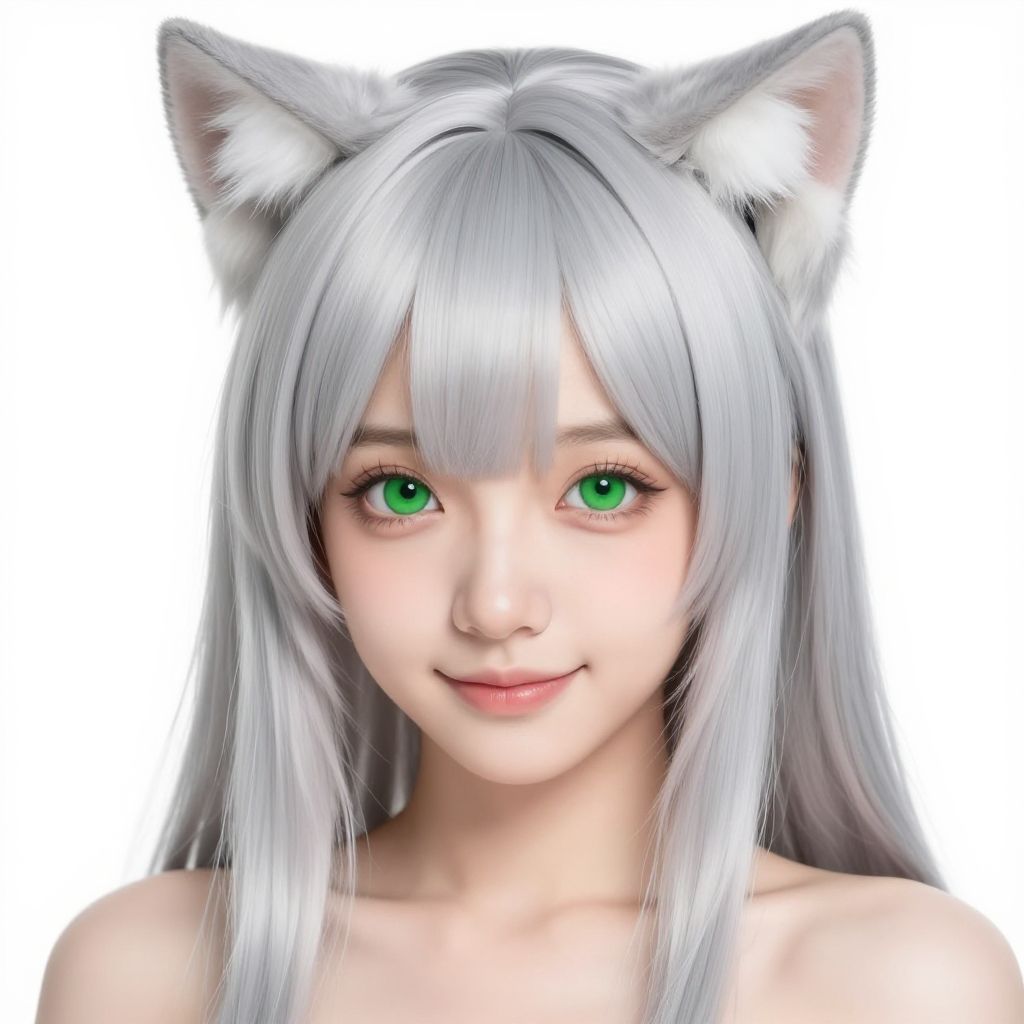 Highly detailed, High Quality, masterpiece, 1girl, solo, looking at viewer, silver hair, green eyes, cat ears, smile, portrait, simple background, (white background)