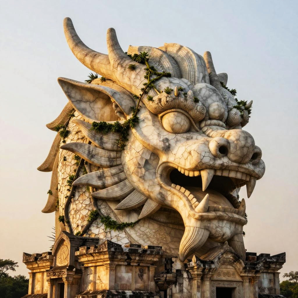 Ancient grus house carved into a massive rock formation on a misty mountain, intricate stone carvings of mythical creatures, swirling clouds surrounding the peak, warm firelight flickering from inside, epic fantasy setting with a sense of mystery