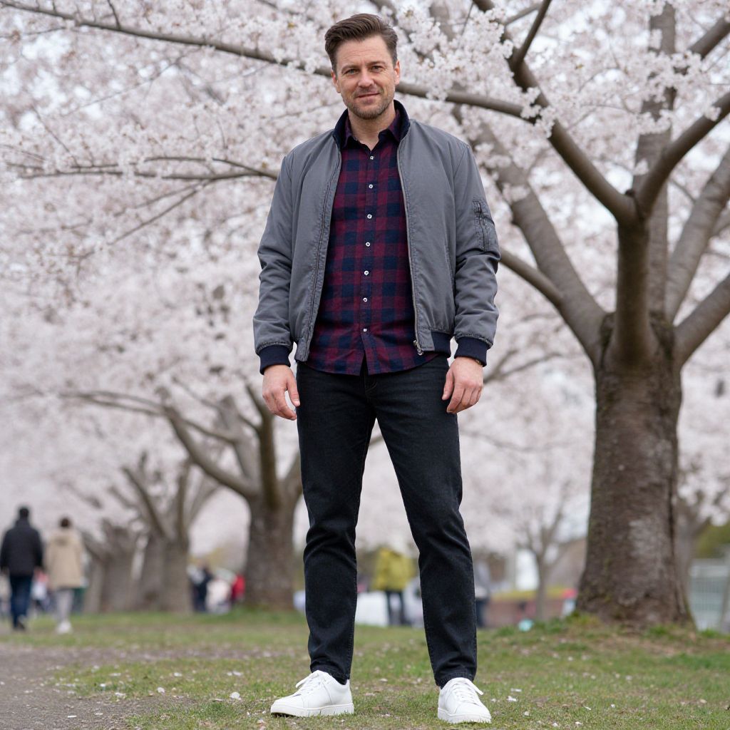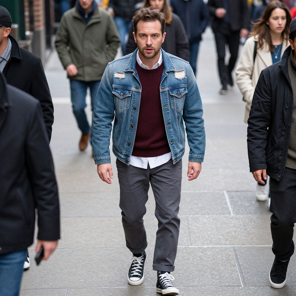 A tall, mid-30s man with short brown hair and a friendly, relaxed expression is wearing a blue and white hoodie featuring a bold, detailed shark design on the front. He is standing on a busy city sidewalk, surrounded by a diverse group of people in the background—some walking, some chatting, others looking at their phones. The scene is set during a sunny afternoon in a modern urban neighborhood, with the soft golden light casting gentle shadows. The background includes brick buildings, parked cars, and a small street sign with a 'Park & Ride' notice, adding to the everyday, vibrant atmosphere.