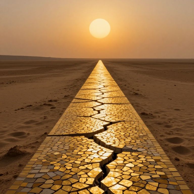 Photograph of a cracked, golden mosaic pathway stretching into a desert under a glowing, orange sunset, creating a striking contrast.