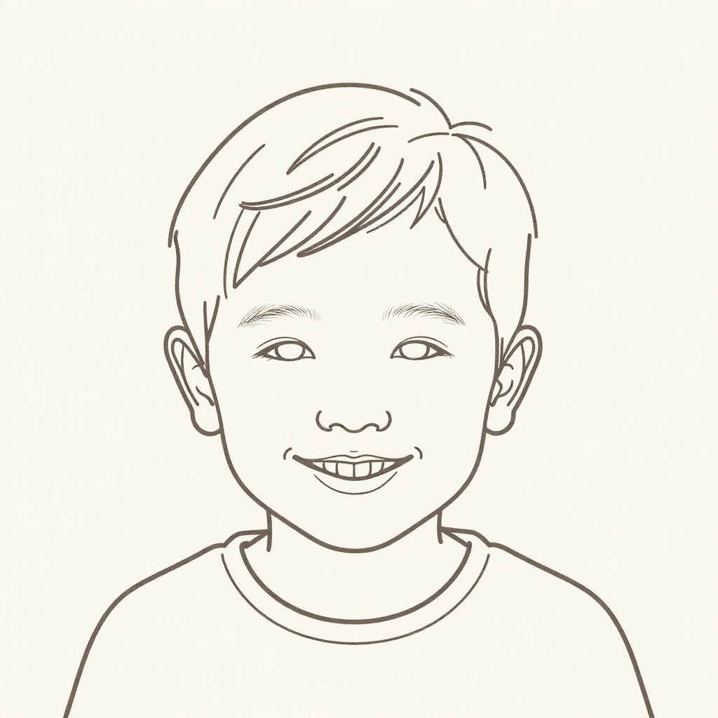 One line portrait of a smiling child, simple continuous single line, soft and delicate lines capturing innocence, light pastel background, modern minimalist style, artistic interpretation focusing on eyes and smile