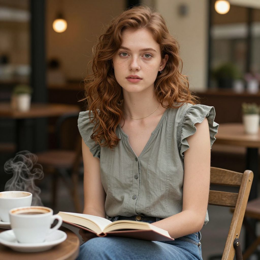 A serene woman with fair complexion and warm amber eyes offers a calm, alluring smile while reading a book on a balcony overlooking a city skyline, the sky painted in hues of orange and pink at sunset