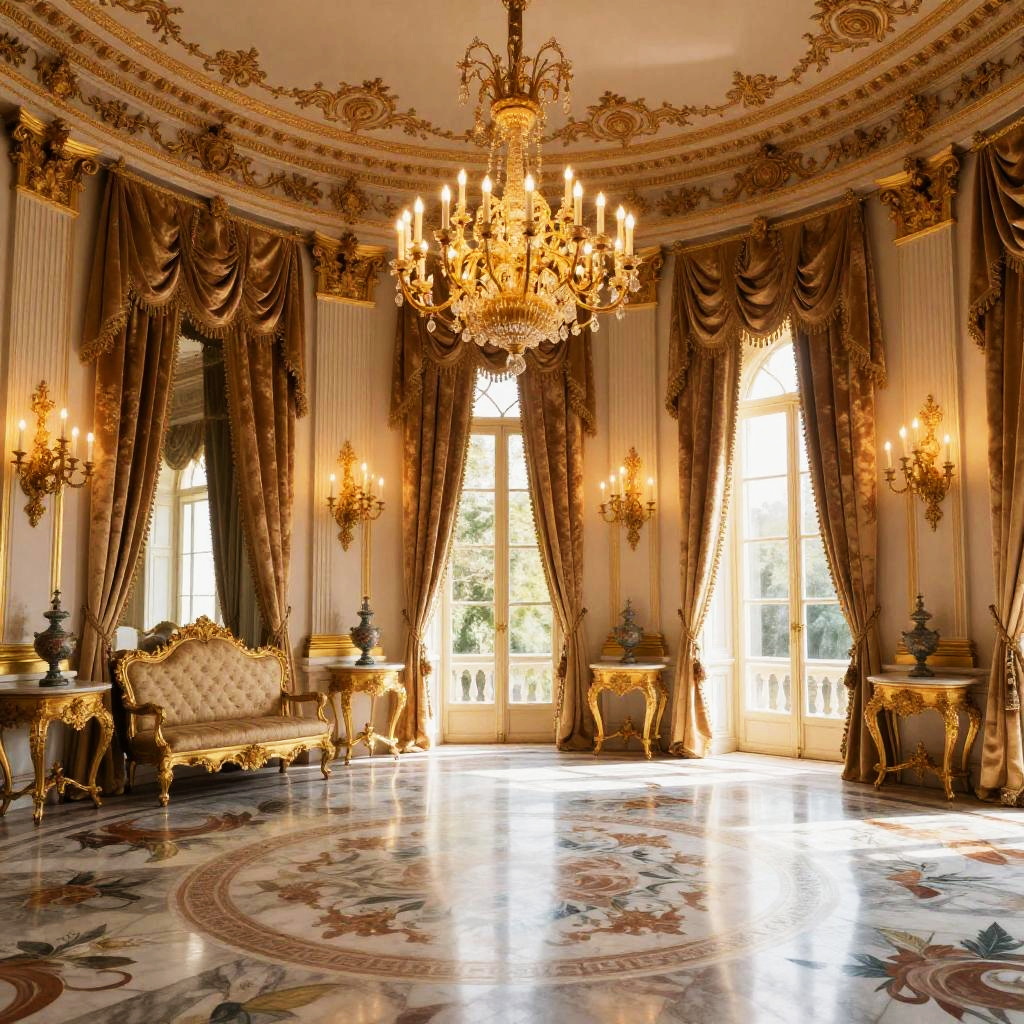Luxurious palace interior with golden chandeliers, velvet drapes, intricate marble floors, and ornate furniture, bathed in warm sunlight filtering through large windows, capturing opulence and grandeur in rich detail.
