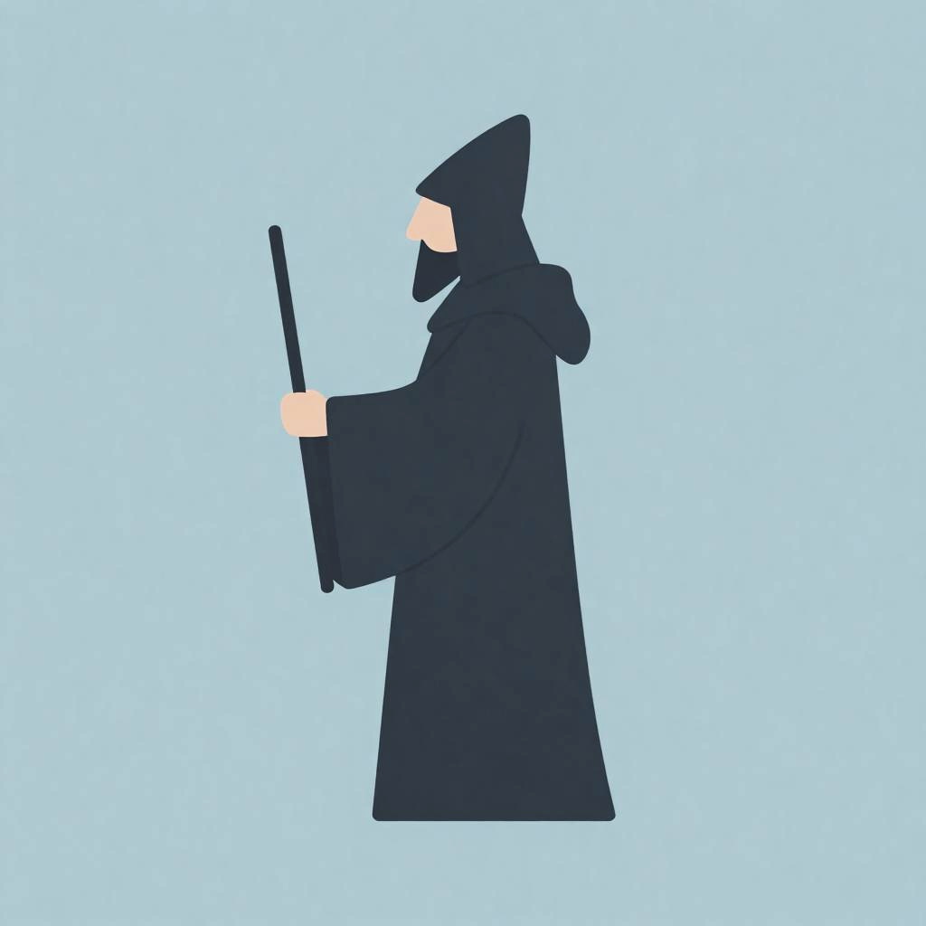 This is a digital illustration in a minimalist, flat art style. It features a silhouette of a figure dressed in a dark blue, hooded cloak, holding a black staff with both hands. The figure's face is partially visible, showing a pale beige triangular shape for the eyes and a small, black triangular shape for the mouth, resembling a beard. The background is a solid, light blue, creating a stark contrast with the dark blue cloak. The figure is positioned in profile, facing left, with the hood casting a shadow over the top of the head. The overall style is simple and abstract.
