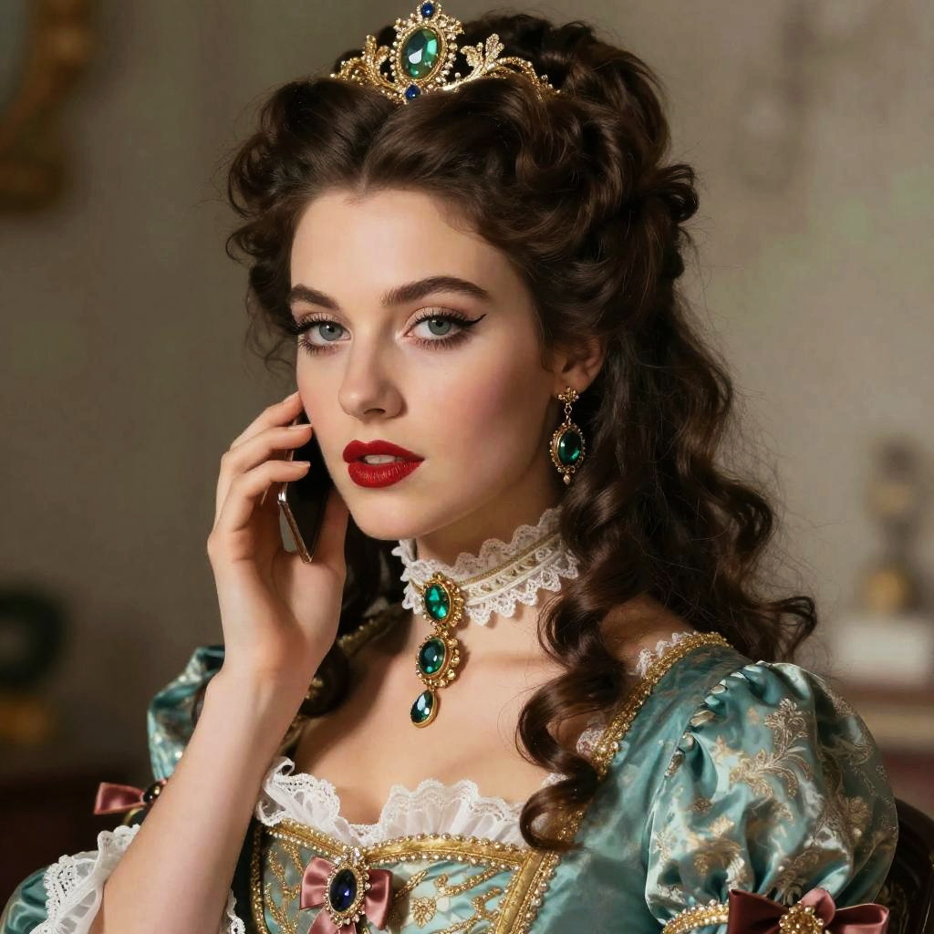 This digital illustration features a fair-skinned, brown-haired woman with wavy locks adorned with a golden crown. She wears a teal, Victorian-style dress with puffed sleeves, gold trim, and white lace accents. The dress is corseted with red and gold ribbons at the bust and waist. She also has white lace cuffs and a blue ribbon bow at her neck. Her large, dark eyes are accentuated with eyeliner, and she wears white teardrop earrings. The background is a simple, solid light gray, highlighting the detailed, colorful character. The art style is reminiscent of 2D anime with bold lines and vibrant colors.