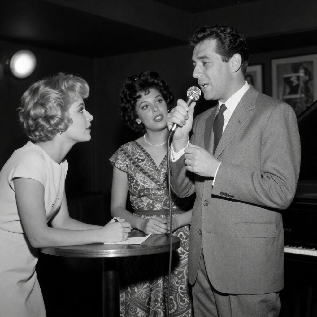 Black-and-white photograph of a 1960s jazz club scene. A man in a suit with dark hair sings into a microphone, standing beside a woman with short curly hair in a patterned dress. Another woman with blonde hair and a white dress leans over a table. The background includes dim lighting and a piano.