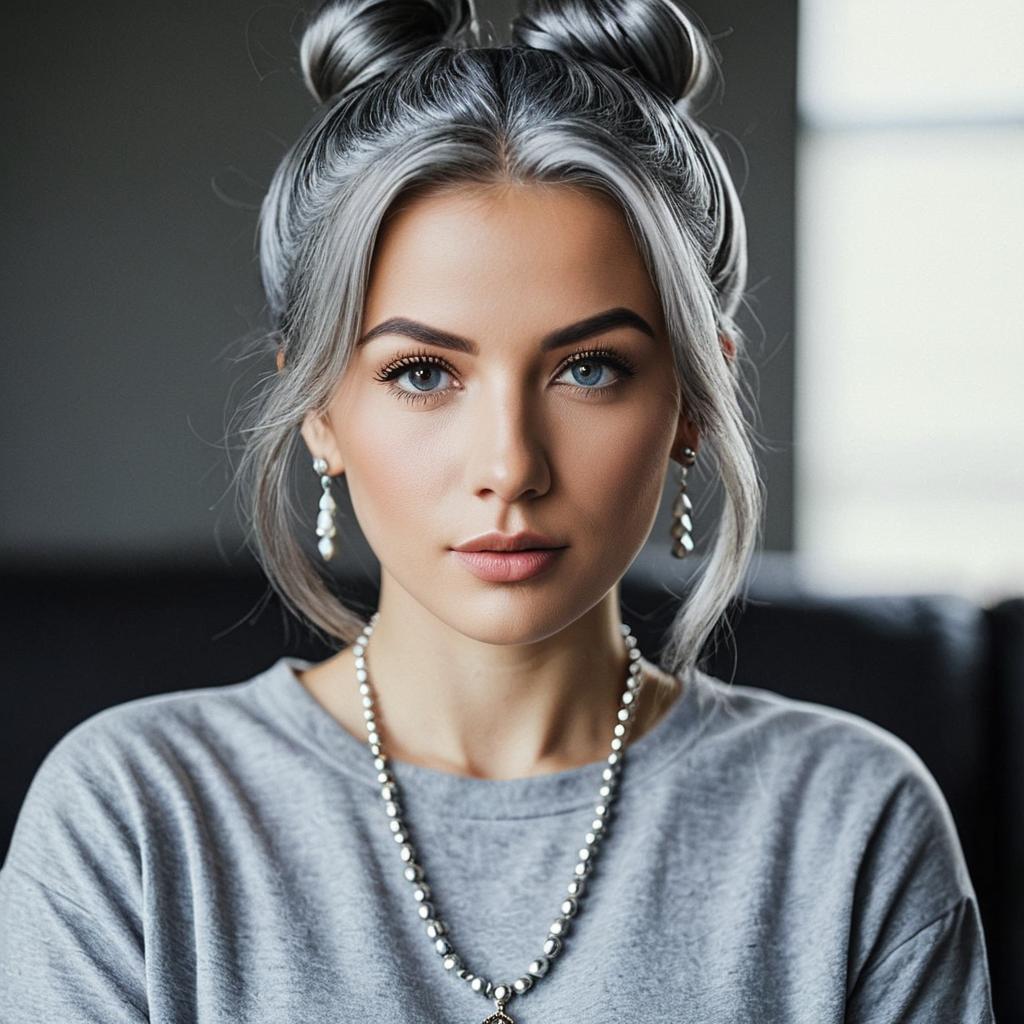 Photorealistic close-up portrait of a young woman with voluminous silver and gray wavy hair, light skin, and blue eyes. She wears subtle makeup, a light gray top, and multiple layered silver necklaces. The background has a soft gradient of silver and pink tones, with soft lighting highlighting detailed hair strands and a symmetrical face. The expression is calm and elegant, styled in a CGI photorealistic manner.