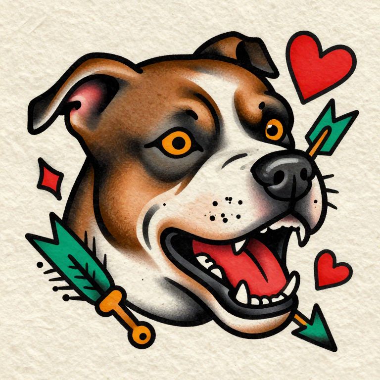 Traditional style pitbull tattoo design featuring a snarling dog head, bold dark lines, classic red and green color palette, surrounded by traditional tattoo elements like hearts and arrows, thick shading for depth, rough texture reminiscent of old tattoo flash art.