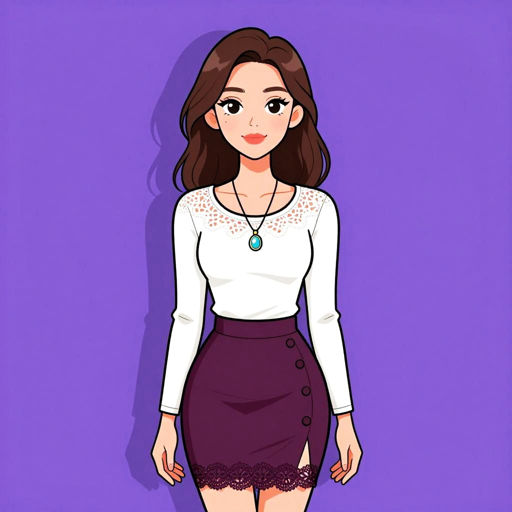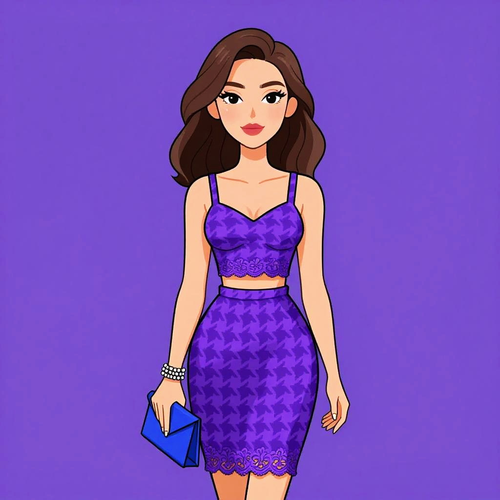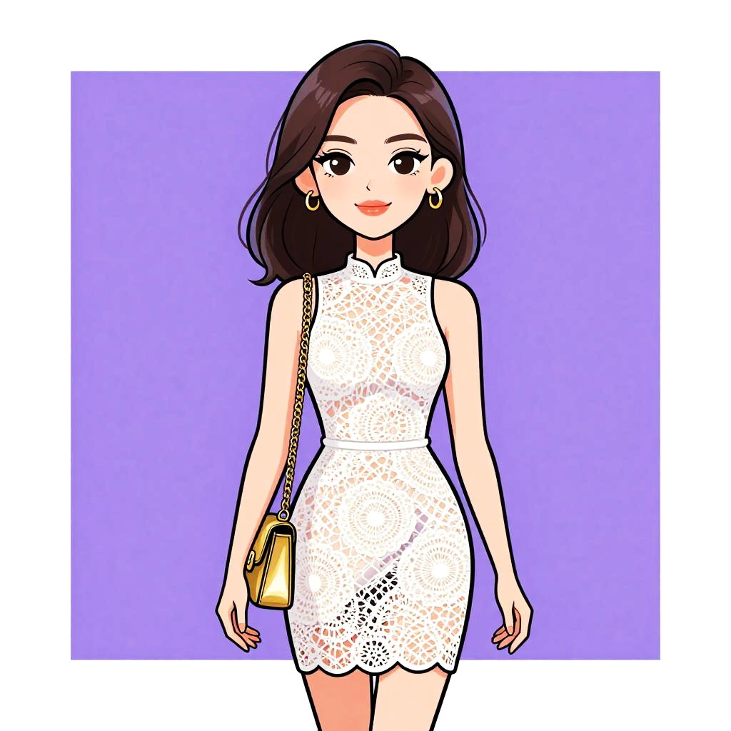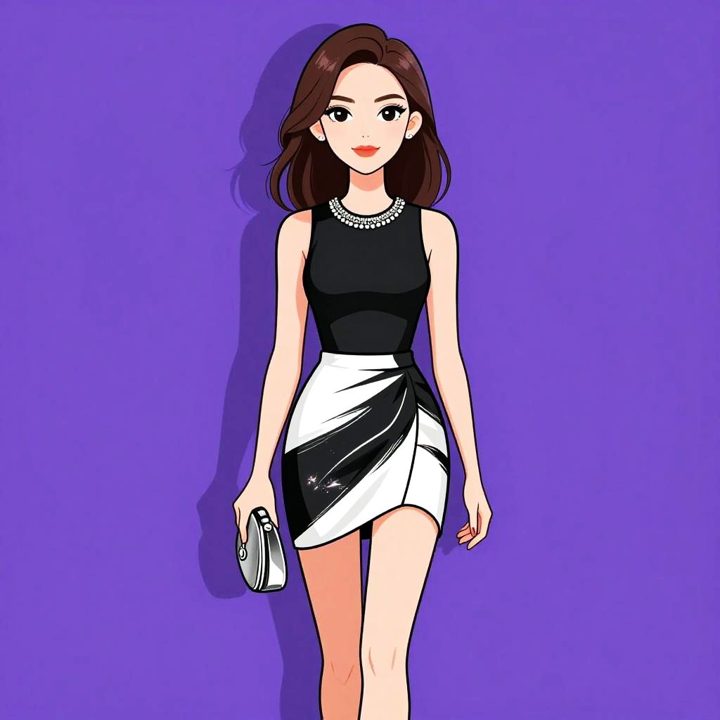 Woman with pretty face and pretty hair. Woman, chic, sleeveless black lace top with intricate patterns, high neckline, scalloped edges, paired with a blush pink A-line mini skirt featuring silver zipper accents, black clutch with chain strap. --sref 1467