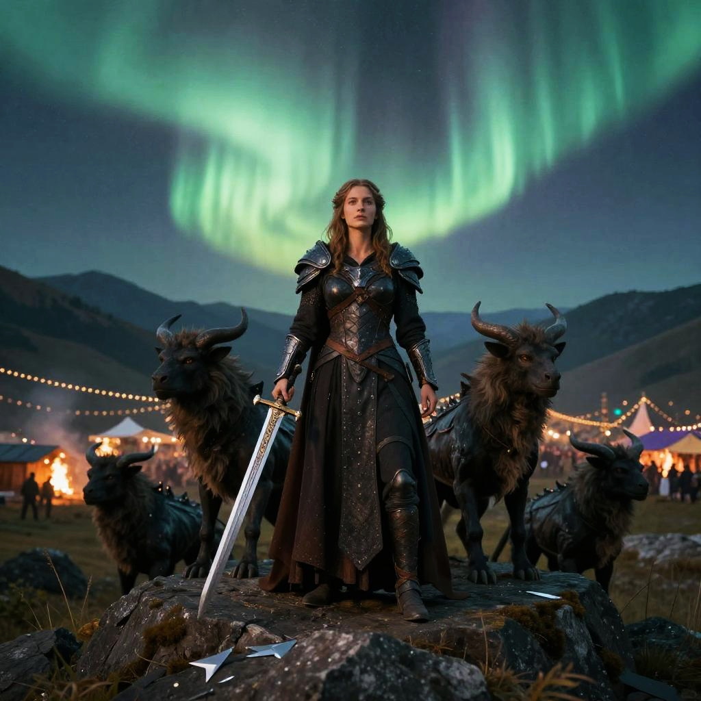 In a breathtaking snowbound fjord with aurora-lit cliffs, illuminated by shimmering emerald aurora, a stoic Viking shieldmaiden leads a group of adventurers through a mystical environment, adorned in intricate armor, surrounded by enchanting details.