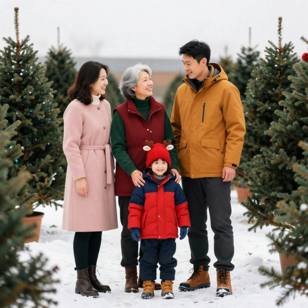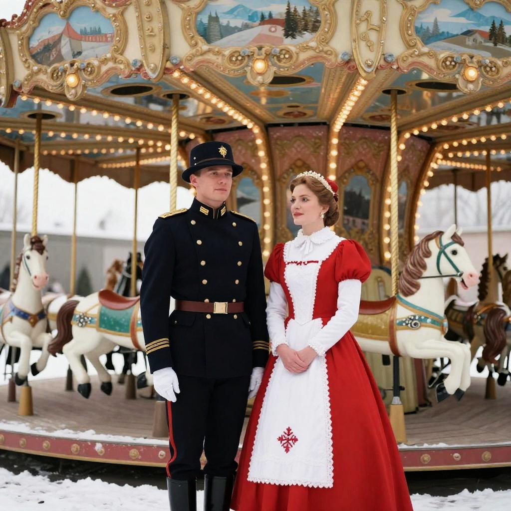 Photograph of five people standing outdoors in a snowy scene during Christmas time. Three men wear black and red military-style uniforms with gold trim and white gloves, one waving. Two young girls dress in a green cloak and a red dress with white tights and black shoes. A woman in a red gown with white fur trim and white gloves stands beside them. Christmas tree decorated with lights and ornaments in the background along with snow-covered ground and building.
