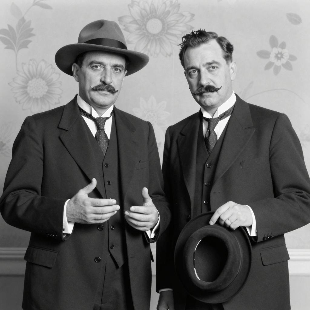 Black and white photograph of two men standing side by side. Both wear dark suits, vests, and ties. The man on the left has a mustache, a wide-brimmed hat, and his hands are gesturing with palms up. The man on the right has short hair, a pointed mustache, and points forward with his right hand while holding a hat in his left. Background features a detailed floral pattern.