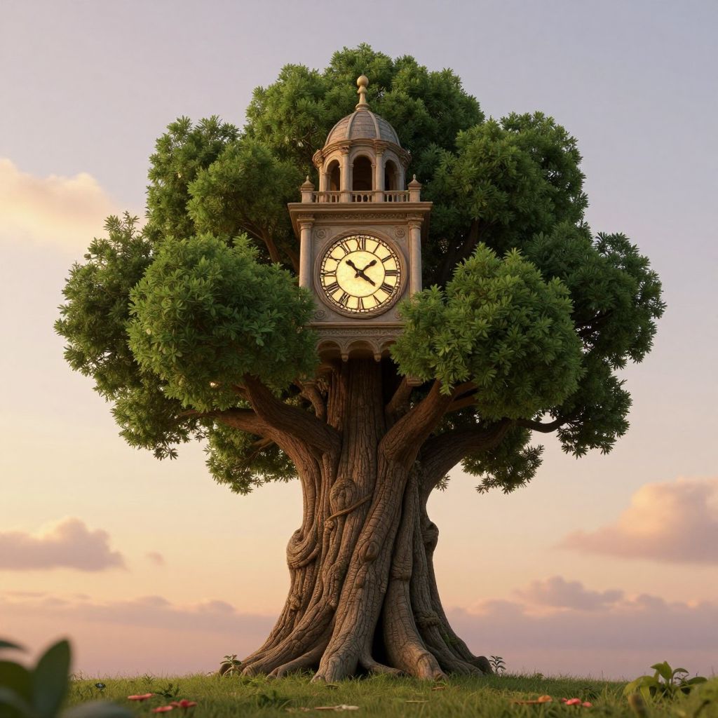 A surreal 3D-rendered scene depicts an ancient clocktower seamlessly integrated into the gnarled trunk of a colossal, verdant tree, its Roman numeral clock face glowing softly against the backdrop of a dreamy, golden-hour sky, evoking a timeless, ethereal atmosphere.