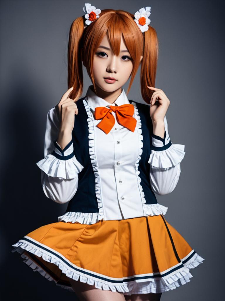 Sexy cosplay woman character wearing Haruhi Suzumiya costume. Realistic photo. Jane Doe dressed as Haruhi Suzumiya --sref 1404
