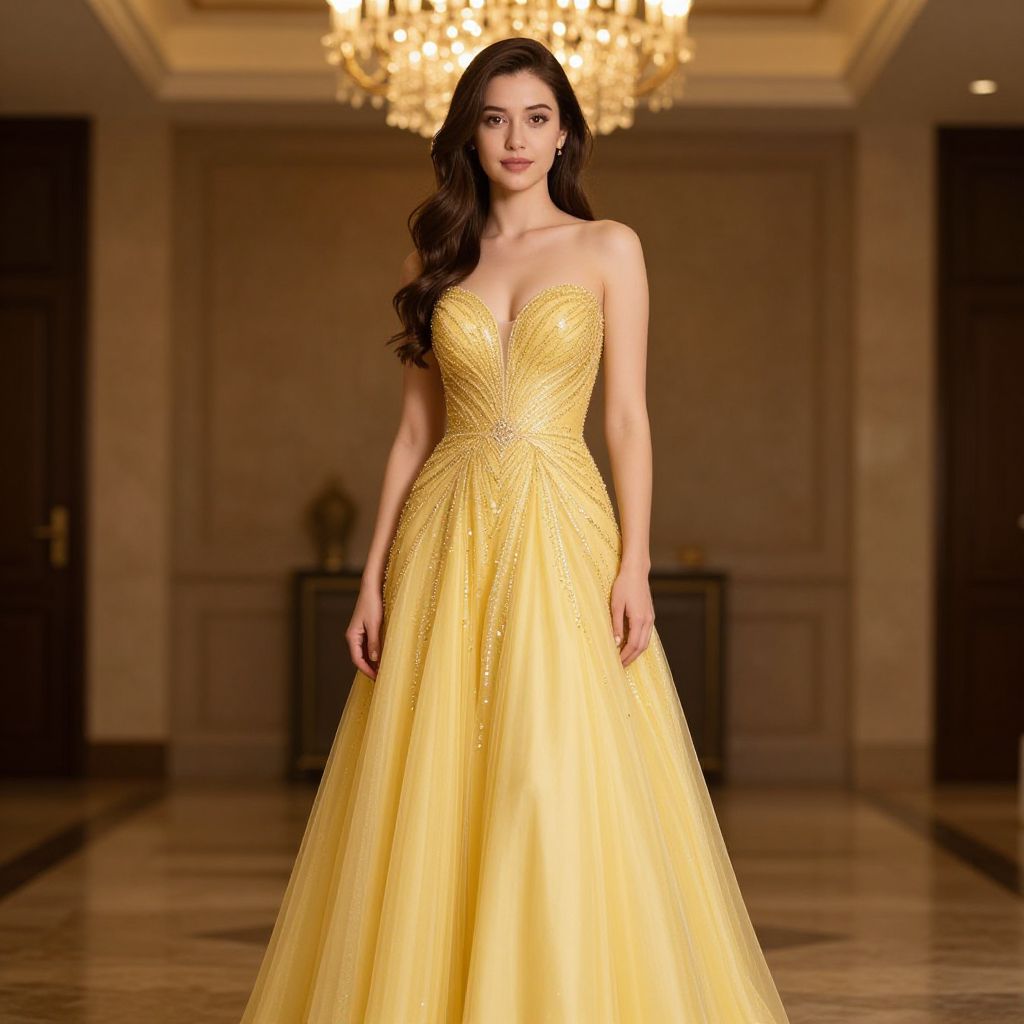 Gold ball gown prom dress, 1girl, solo, dress, brown hair, long hair, breasts, indoors, chandelier, yellow dress, looking at viewer, bare shoulders, brown eyes, cleavage, standing, realistic