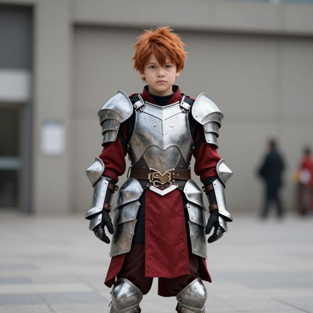 Photograph of a young boy with red hair in silver medieval armor and red tunic, standing confidently in an urban plaza. Blurred background includes people