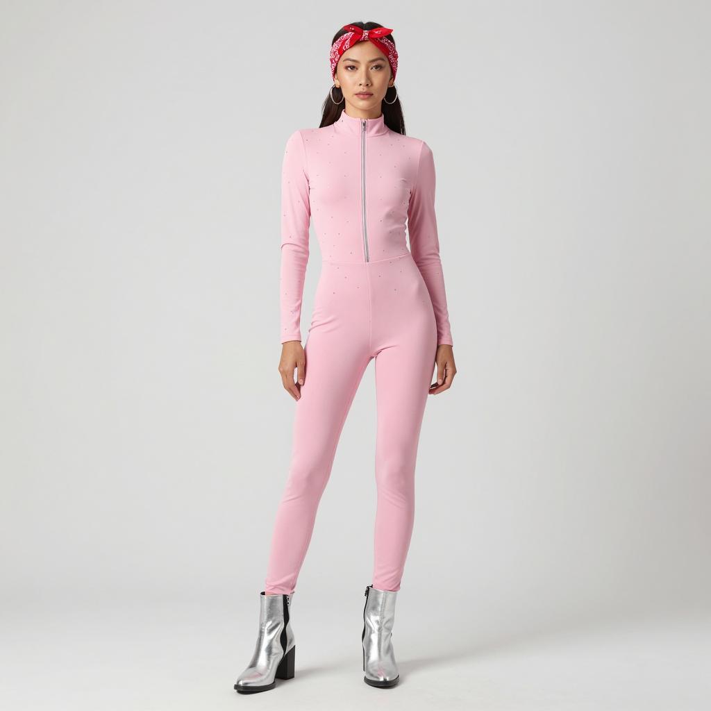 Full-length portrait of an Asian woman wearing a retro-futuristic pink jumpsuit with metallic silver dots, featuring a front zipper closure, long sleeves, high neck, and a fitted silhouette. She accessorizes with a red bandana tied in her hair, large hoop earrings, and metallic silver ankle boots with block heels. The background is a plain white studio setting.