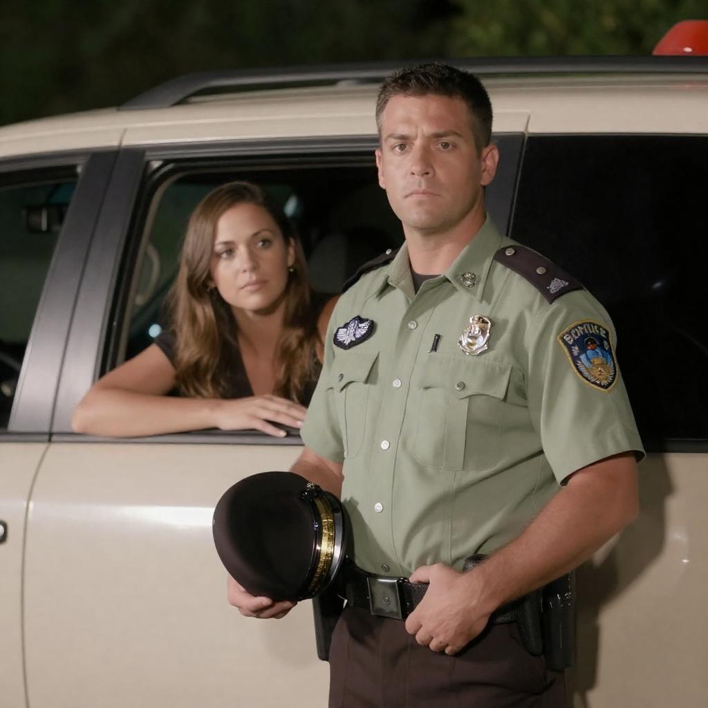 Photograph of a nighttime scene. A male police officer with short brown hair, light skin, and a serious expression stands in the foreground, holding a hat in his right hand. He wears a light green uniform with a badge. In the background, a female with light brown hair and light skin leans out of the open car window, looking forward with a neutral expression. The car is beige, and the background is dark with green foliage. The officer's left hand rests on his belt.