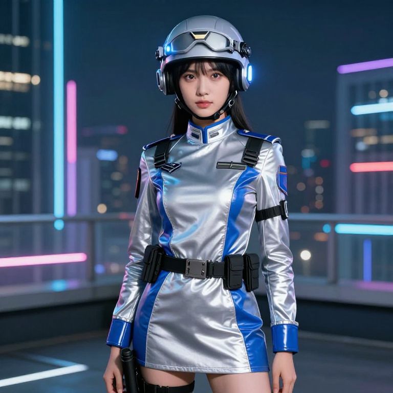 A detailed photo of a girl dressed as a futuristic girl army officer in a shiny silver and blue fancy dress outfit, complete with a futuristic uniform, helmet with glowing lights, and a tactical belt, standing on a modern city rooftop with neon lights in the background, realistic skin tone, clear facial features, determined expression