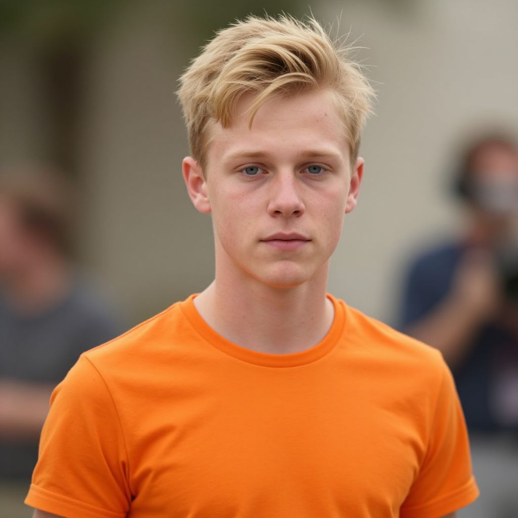 "fred flintstone man costume, 1boy, male focus, solo, realistic, looking at viewer, blurry, upper body, blurry background, blue eyes, closed mouth, blonde hair, orange shirt Realistic photo of casual sexy person with pretty face"