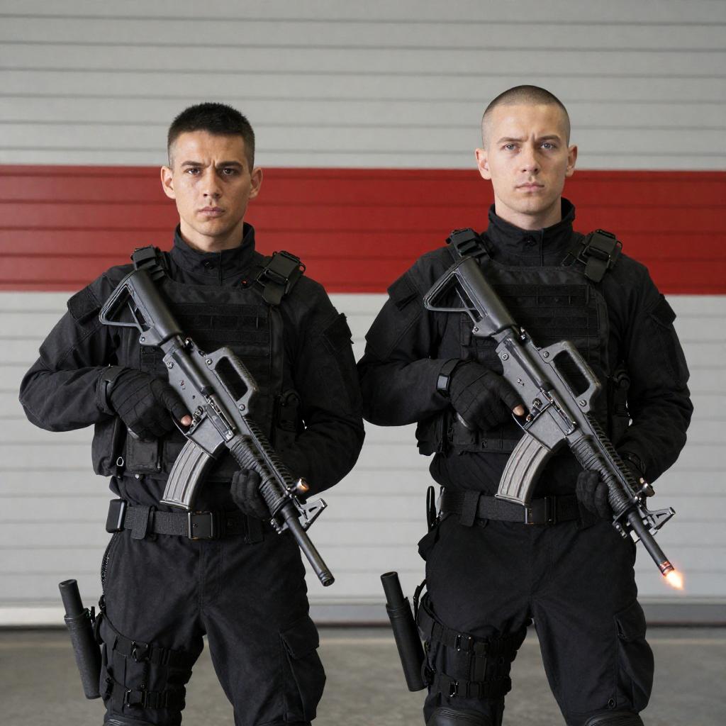 Two bald, muscular men in black tactical gear face each other, holding assault rifles. They stand against a bright white background with black rectangular objects. Both men have serious expressions and wear gloves. The man on the left has a tattoo on his right arm.
