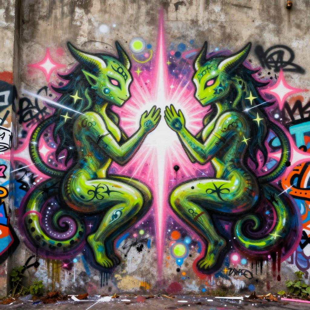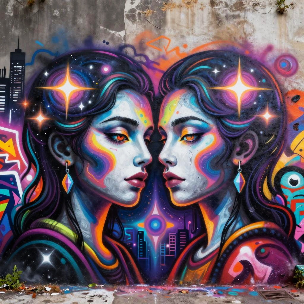 Gemini graffiti artwork showing symmetrical twin characters in mirrored poses, bright fluorescent colors, elaborate spray paint layering, urban decay backdrop, cyberpunk influence, bold and captivating.