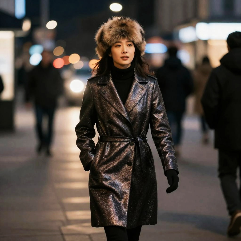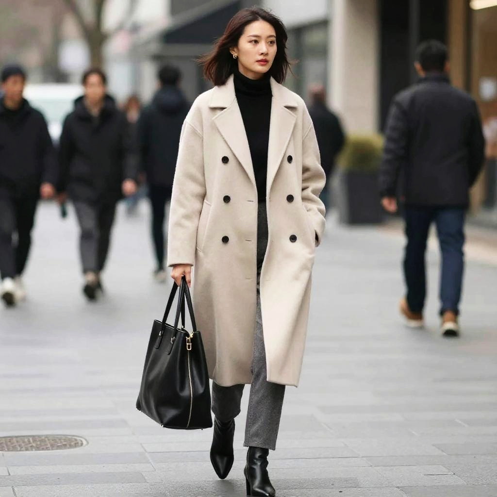 Moose Knuckle Coat Woman, woman in a tan coat and jeans walking down a snowy street