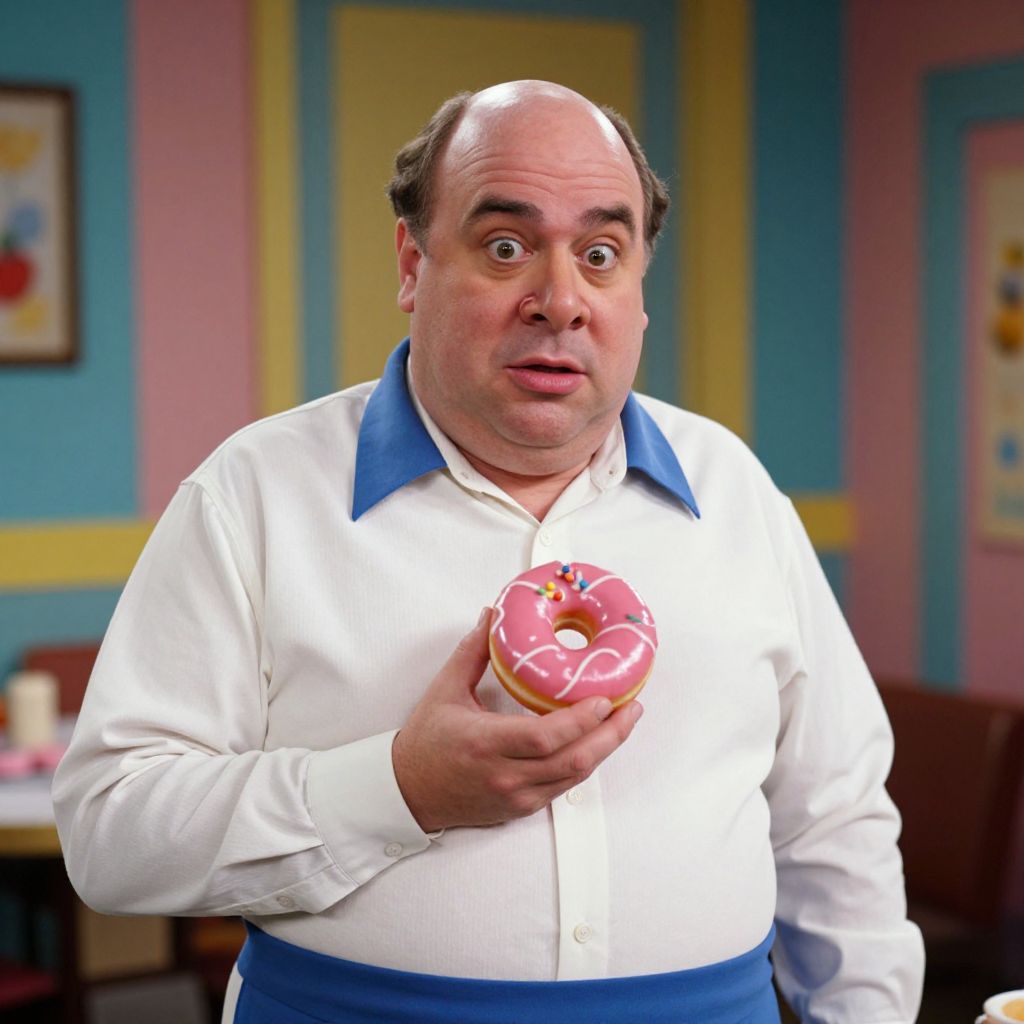 In this highly detailed and realistic image, a middle-aged man with an overweight, bald head and a rounded belly is depicted in a cinematic 80s sitcom setting. His small, close-set eyes and mono-brow are accentuated by a bulbous nose, giving him a distinctive and memorable appearance. He is dressed in a white shirt with a blue collar and blue pants, holding a pink donut in his hand, which is adorned with a decorative topping. The background features a colorful, striped wall, adding to the vibrant and nostalgic atmosphere of the scene. The lighting is cinematic, with a high level of detail and depth of field, creating a sense of realism and immersion. The shot is taken with a 50mm lens on 35mm film stock, using an ultra-wide angle, enhancing the dramatic effect. The overall composition is carefully arranged, with the man positioned centrally, drawing the viewer's attention to his expressive face and the pink donut, which stands out vividly against the colorful background. The image is beautifully color-coded and color graded, with a cinematic color palette that enhances the visual appeal and emotional impact of the scene.