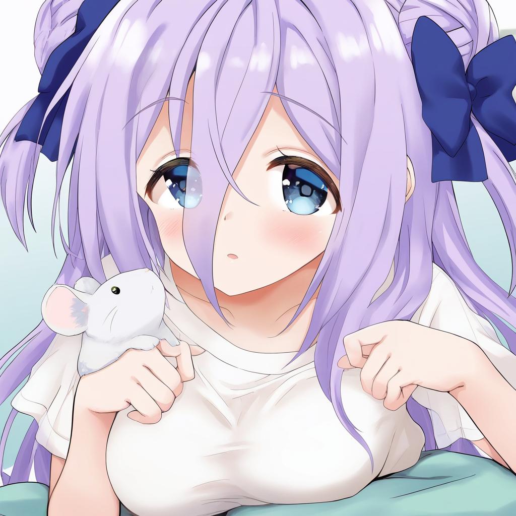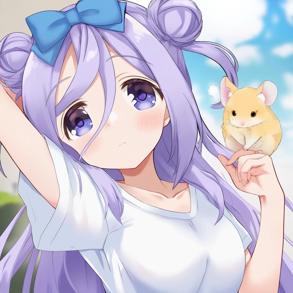 Amamiya shizuku (hizuki yayoi), original, 1girl, hair between eyes, blue eyes, purple eyes, purple hair, very long hair, blue hair, two side up, double bun, hair bow, medium breasts, collarbone, white shirt, blue bow, chinchilla (animal), animal, by artist ayanero taicho, leet