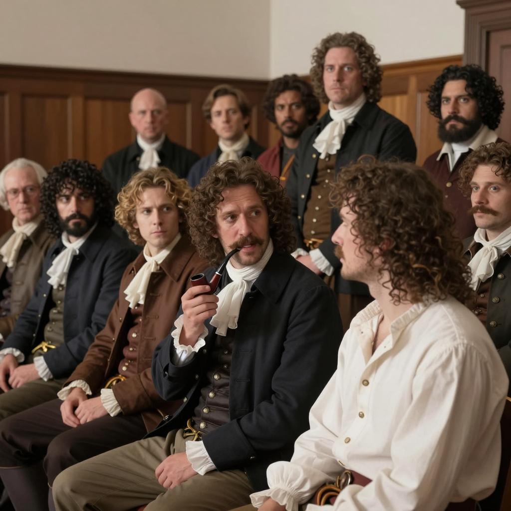 Four people in an opulent room with red curtains and multiple candles. Three people in 18th-century clothing, one with white wig, another with green coat and white wig, third with brown coat. Fourth person, in white shirt and beige pants, is seated and leaning forward. The man in green coat stands to the right, woman in green coat stands to the left, holding a candle. Seated person looks downward. Warm, dim lighting.