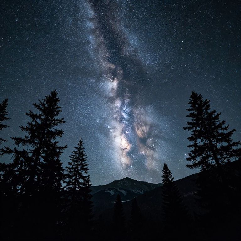 Photograph of a night sky showcasing the Milky Way galaxy, with dense clusters of stars and bright celestial core. Silhouetted tall pine trees frame the bottom, while a dark mountain range sits at the mid-ground. The sky is deep blue, transitioning to black at the top, with the Milky Way's white and blue hues prominently illuminated. The texture of the sky appears grainy, adding a sense of depth and realism. The overall scene evokes a serene, awe-inspiring natural landscape.