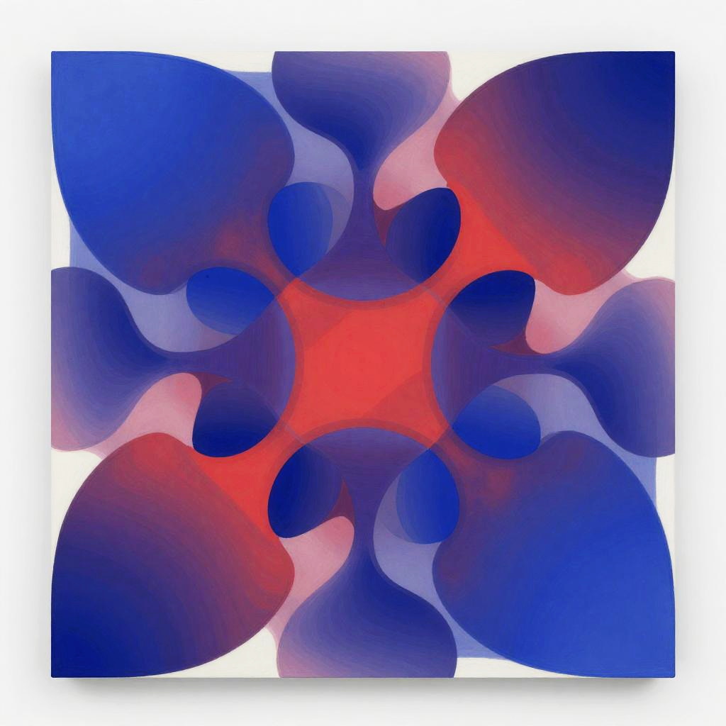 Cac, an abstract artwork featuring layered organic shapes and flowing lines representing chaos and harmony, vibrant color gradients blending blues, reds, and purples, dynamic composition with a sense of movement and energy, modern digital painting