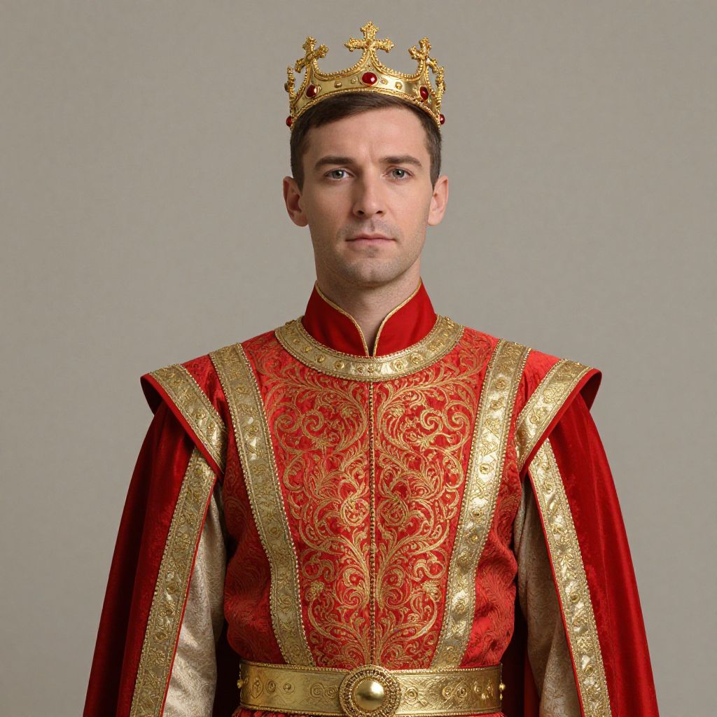 Photograph of a Caucasian man with short dark brown hair and fair skin, wearing an elaborate royal costume. He has a solemn expression and is adorned with a gold crown featuring intricate designs and red gemstones. His red velvet robe is heavily embroidered with gold patterns and trimmed with gold fabric along the shoulders and sleeves. The robe is fastened with a gold belt at his waist. The background is a plain, solid gray, ensuring focus remains on the subject. The costume's texture is rich and luxurious, emphasizing regality.
