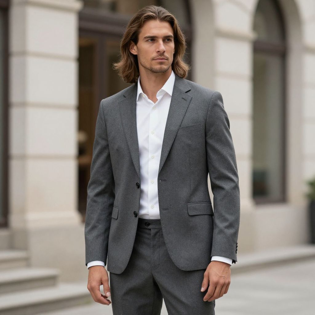 Man wearing a grey suit with a white shirt and grey pants. The man has long brown hair and is standing in front of a building.