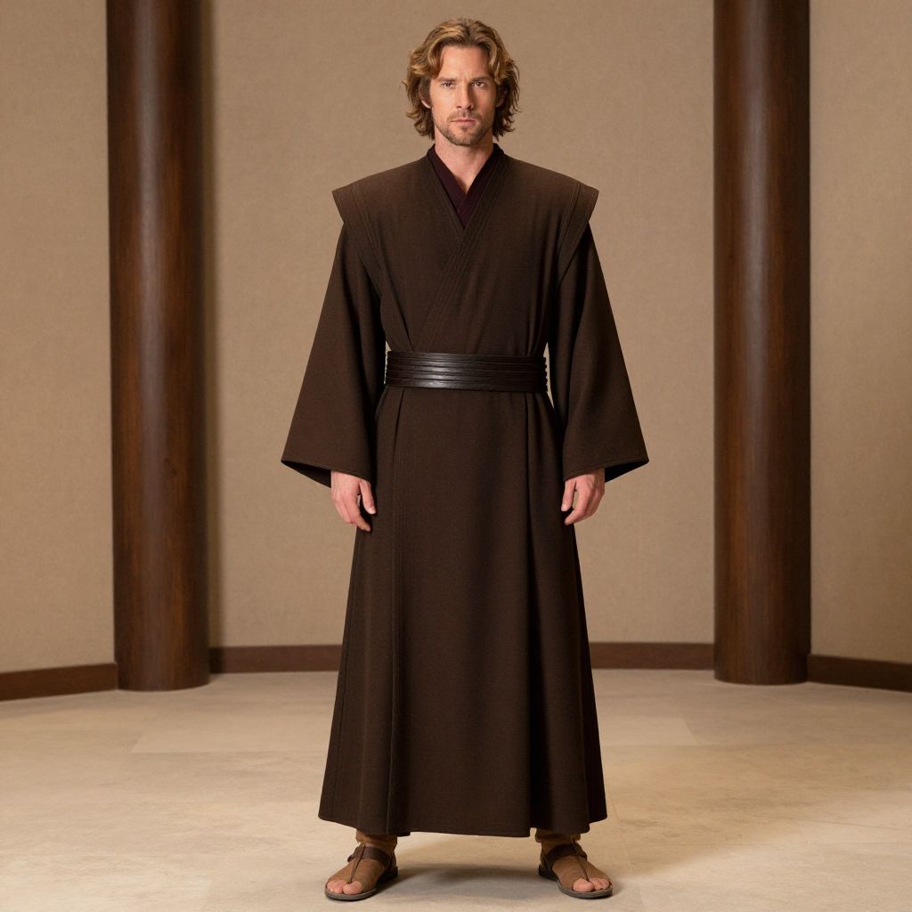 Jedi Robes Costume, man dressed in a robe and sandals standing in a room