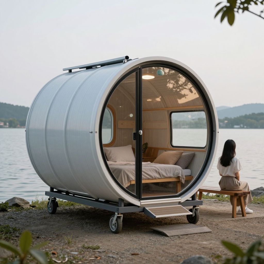 Photograph of a circular, white, metal trailer with a large, open door, situated on a gravel lakeside shore. Inside, a simple bed with white sheets is visible. A woman with long black hair, wearing a white top and beige skirt, sits on a wooden bench to the right, facing the water. The trailer has black wheels and is parked near the water's edge. The background shows a calm lake with distant, tree-covered hills under a soft, evening sky. The scene is serene and tranquil, with natural light highlighting the trailer's sleek design and the surrounding nature.