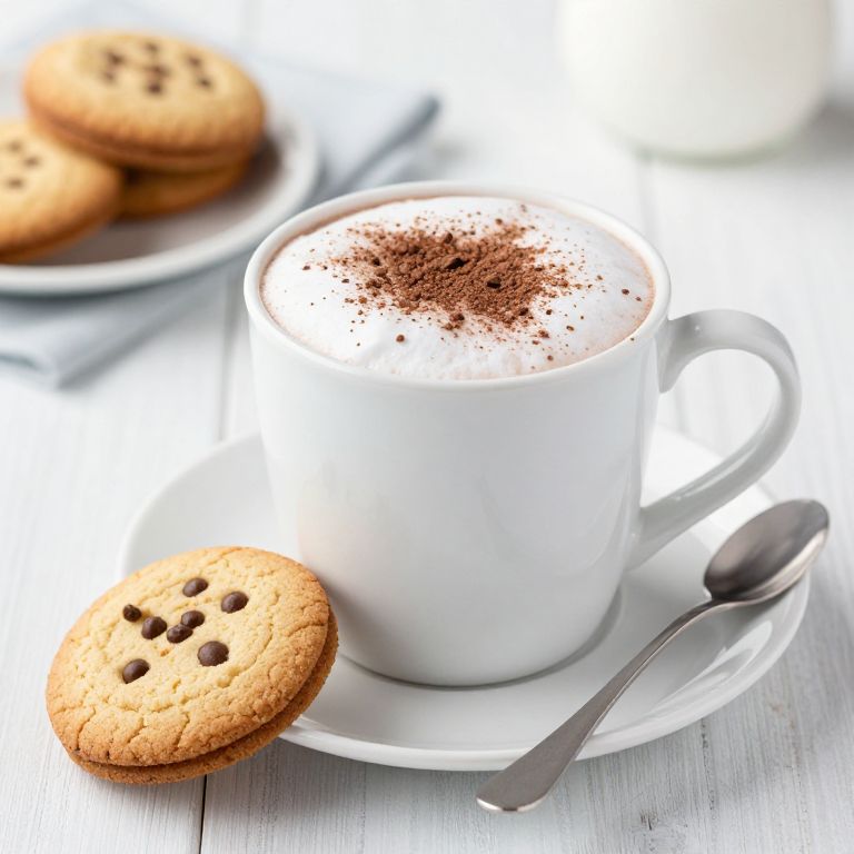 Photograph of a white ceramic cup filled with frothy hot chocolate, sprinkled with chocolate powder, on a matching saucer with a silver spoon. In the foreground, a single chocolate cookie with four holes is placed near the cup. The background features a blurred white plate with additional cookies. The setting is on a white wooden surface, with soft natural light enhancing the cozy, inviting atmosphere.