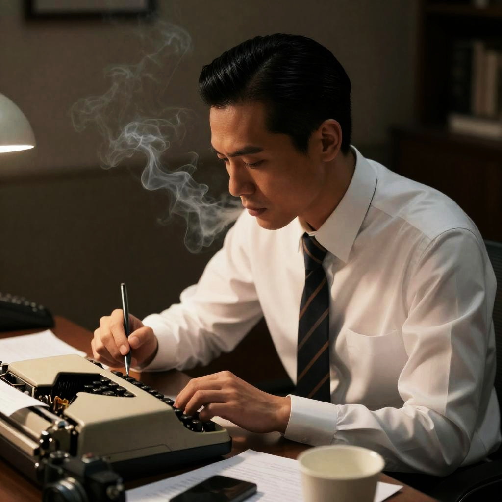 Asian man with slicked-back black hair wearing a white dress shirt and striped tie, intensely focused while writing at a cluttered wooden desk. The desk features a vintage typewriter, black telephone, camera, coffee cup, and scattered papers. A smoky atmosphere with dim lighting creates a contemplative mood.