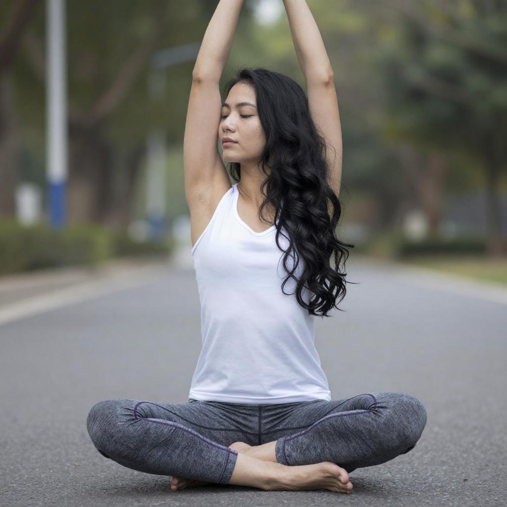 Photograph of a young woman with long, wavy black hair, wearing a white sleeveless top and gray leggings with purple patterns, performing a yoga pose with arms raised above her head and legs in a lotus position. She is barefoot on a paved road with a blurred green and blue background.
